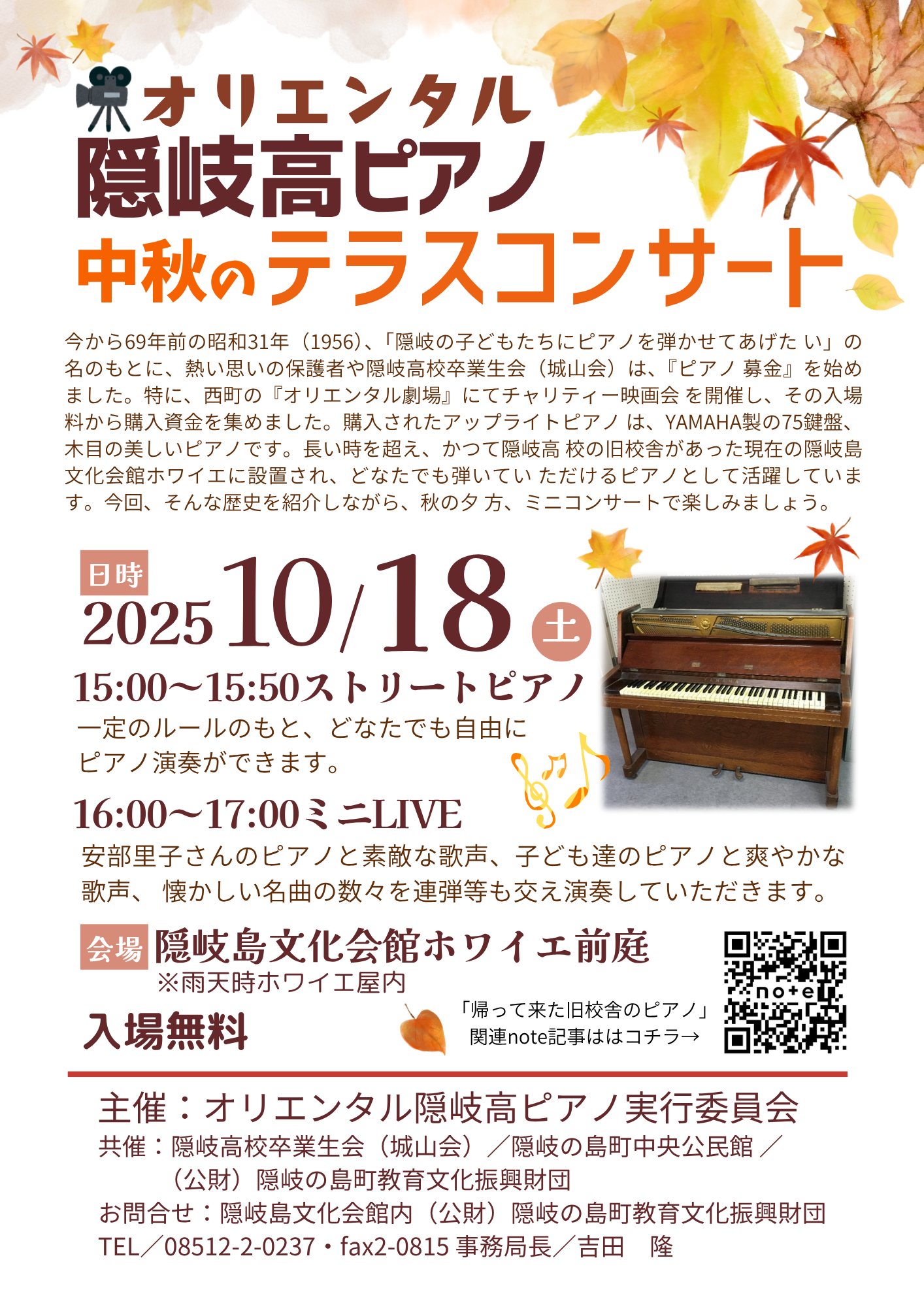 かつて隠岐高校にあったピアノが現在隠岐島文化会館ホワイエにおいてあります。